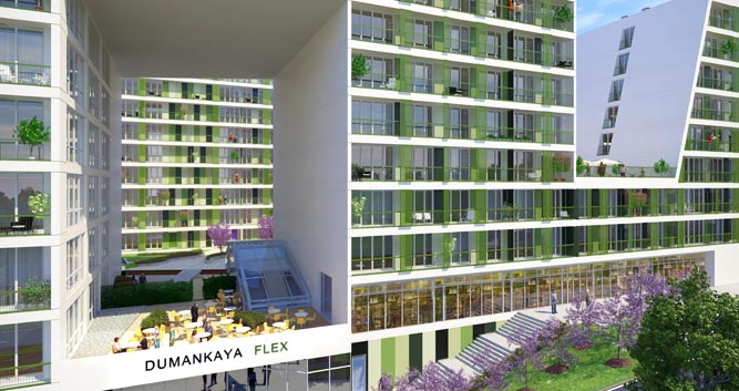 Dumankaya Flex 2 ayrı kütlede 5 blok ve 376 adet home ofis bulunuyor. Proje stüdyo, 1+1 ve 2+1 home ofisten oluşuyor.
